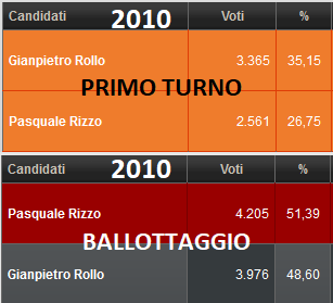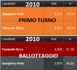 Il 2010 era un’altra epoca. Il contesto elettorale a San Pietro Vernotico era totalmente differente. Anzitutto v’erano più cittadini: 14.473 e poco più di 13mila elettoriPasquale Rizzo vinse sull’allora egemonico PD, a trazione Rollo, grazie ad una alleanza fra Verdi e Italia dei Valori (senza contare l’appoggio al ballottaggio di liste civiche quali quelle di Teobaldo Mingolla e SeL). Da “solo” Rizzo valeva il 26.75% (2.561 voti). Con l’appoggio degli alleati, l’avvocato riuscì a volare sino al 51.39% (4.205 voti), benché la distanza con Rollo non fosse abissale (48.60% per 3.976 preferenze). Quella vittoria significò molto per San Pietro Vernotico, giacché i cittadini chiedevano a gran voce di staccare la spina all’egemonia partitica “romana”. Inutile dire quanto l’inizio della fine per il PD, probabilmente, iniziò con la prima vittoria di Rizzo.