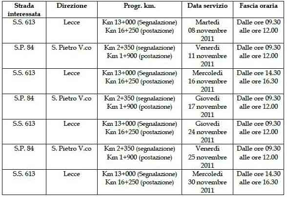TORCHIAROLO – Nuove date autovelox per il mese di novembre 2011. A renderlo noto è il comandate Lorenzo Renna che, sul sito istituzionale di Torchiarolo, enuncia quanto segue: “Si comunica che questo Comando ha predisposto nel mese di novembre 2011, dei servizi di controllo velocità a mezzo apparecchiatura Velomatic 512, senza contestazione immediata, sui tratti di strada e nei giorni indicati nell’allegato schema. Verranno predisposti inoltre, in orari serali, servizi di controllo velocità in centro abitato mediante lo strumento del telelaser sulle seguenti strade: Via Leopardi, Via Foscolo, Via Don Minzoni.